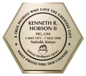 On August 7, 1998, Staff Sergeant Hobson made the supreme sacrifice in service to the nation, when he was killed along with 247 others when terrorists bombed the U.S. Embassy in Nairobi, Kenya. The U.S. Army granted him a posthumous promotion to Staff Sergeant in recognition of his dedicated and courageous service.